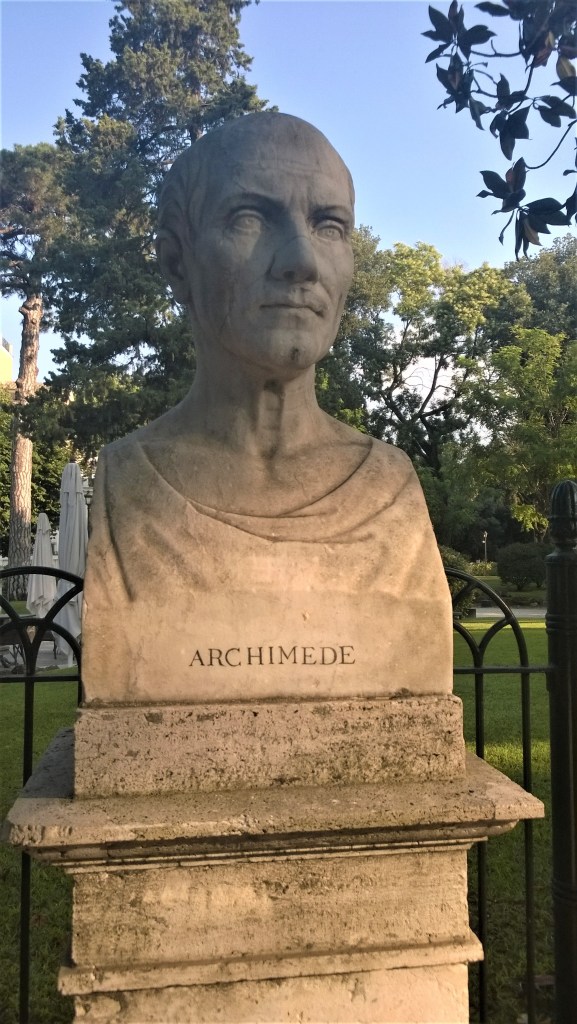 I head up the hill through the Villa Borghese gardens where there is a lovely overlook towards St. Peter’s Basilica and the Vatican. A view Galileo might have had while imprisoned in the nearby Villa Medici for daring to think the world revolved around the sun. The filtered sunlight dapples the stone busts of Archimedes, Hadrian, and Aristotle along the garden paths. I wonder what would they think of us in this 21st Century?