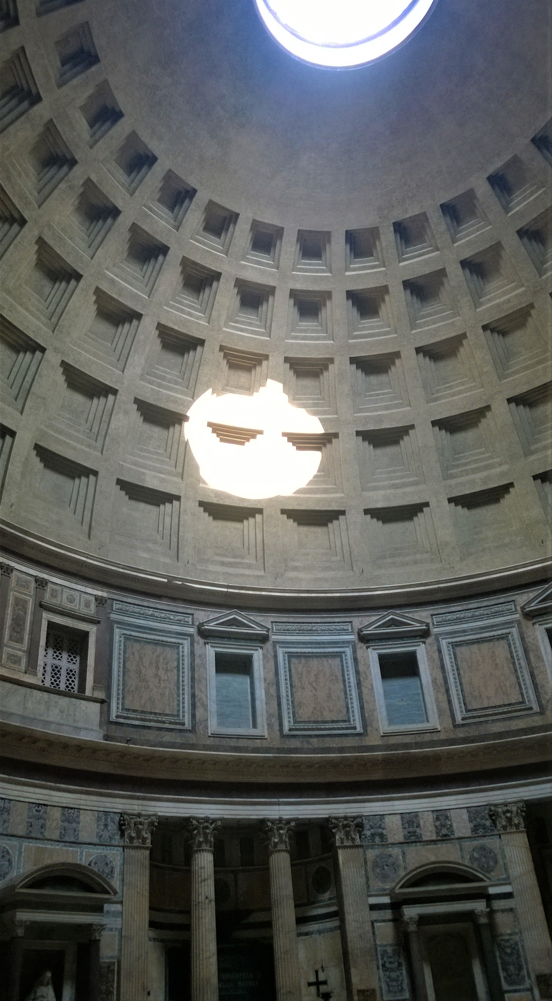 The ancient Roman temple is open and deserted, so I take advantage of the chance to take pictures of this engineering marvel without dozens of onlookers in the foreground, especially with a rare sunspot from the oculus highlighting the sculptural recesses in the dome. The Pantheon’s dome has survived nearly 2000 years due to the “secret sauce” of volcanic ash in the cement — the pumice mixture becomes lighter in each of the higher concourses of the dome.