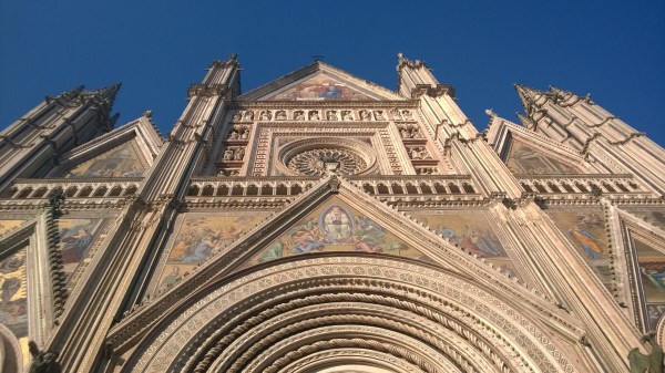 Considered one of the finest examples of Italian Gothic architecture, work began on the magnificent Orvieto Duomo in 1300 and continued nonstop for the next three centuries. Its white marble façade is covered with layers of bas-relief sculptures so lacy and delicate it seems more likely they were carved from Ivory soap than brittle marble.