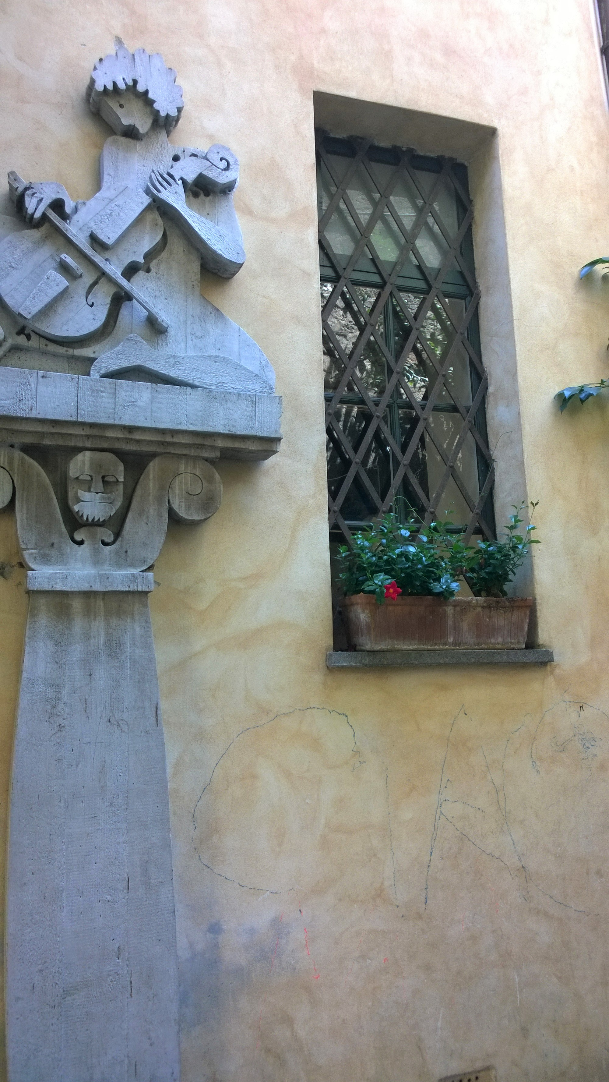 I take more photos outside of the fanciful fountain, known for its grotesque masques and menacing dolphins. This morning the water is a glassy mirror except for the trickling spray.