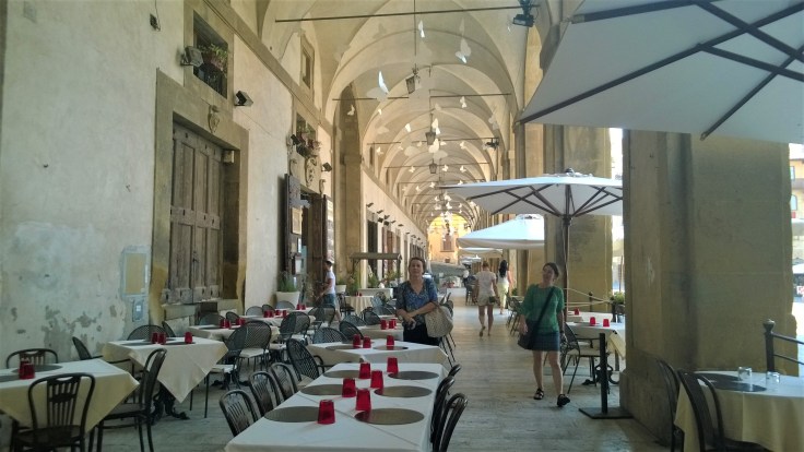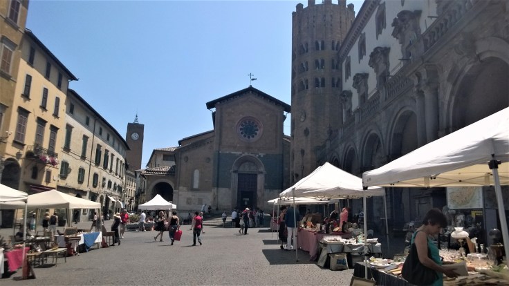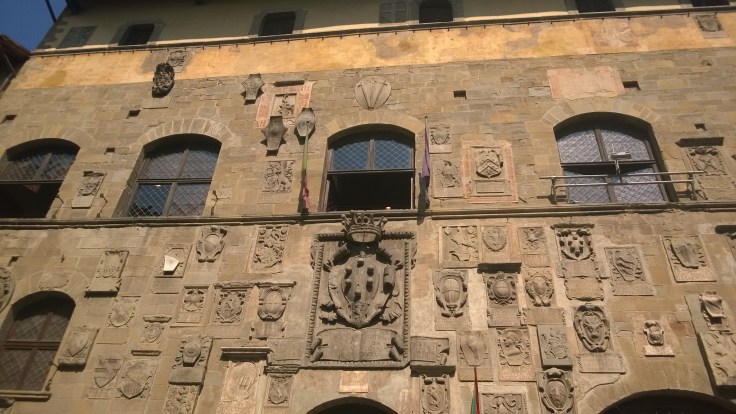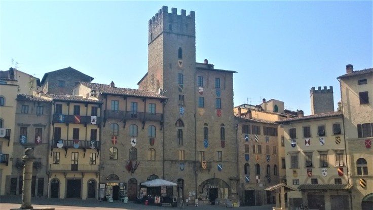 The Piazza Grande is also the site of the Joust of the Saracens held annually every September where the entire town dresses up in medieval costumes to cheer knights on horseback who charge a wooden Saracen king with their lances. I love how every town in Italy has their own unique “La Festa” or festival in their main square or piazza. I pick up several postcards and a booklet on the Joust for my son who is enamored with knights and medieval history.