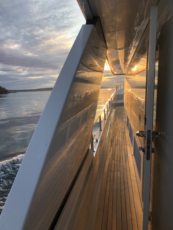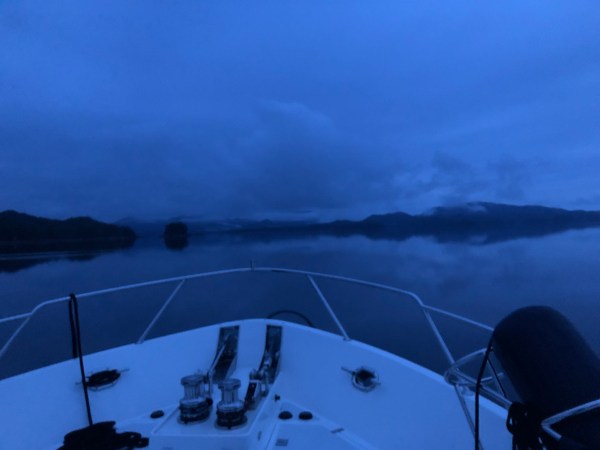 The hum of our generator wakes me. I can hear Chris making coffee and he’s already pulled in our shore power cord and the two spring lines. I climb down from the snug bed in the forward V-berth and pull on a turtleneck, pair of leggings and fleece sweatshirt. It’s still pitch black, but our last leg in this amazing journey will take twelve hours or more so he’s getting the boat ready to leave just before first light. Dew still clings to our deck and windows, so I grab a cup of coffee and head up to the pilot house.