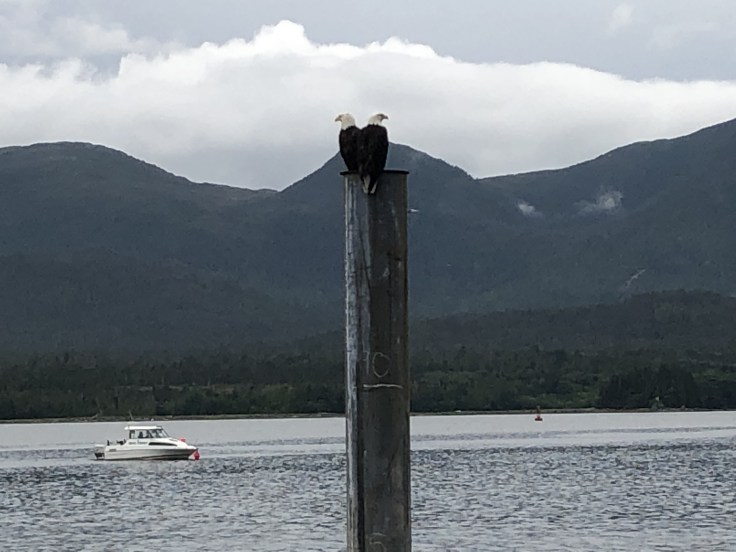 After the last cruise ships depart and all the floatplanes have been tethered for the evening, the mist clears on the Tongass Narrows. It is still light at 9:30 pm as we watch two majestic eagles atop the piling next to our boat.