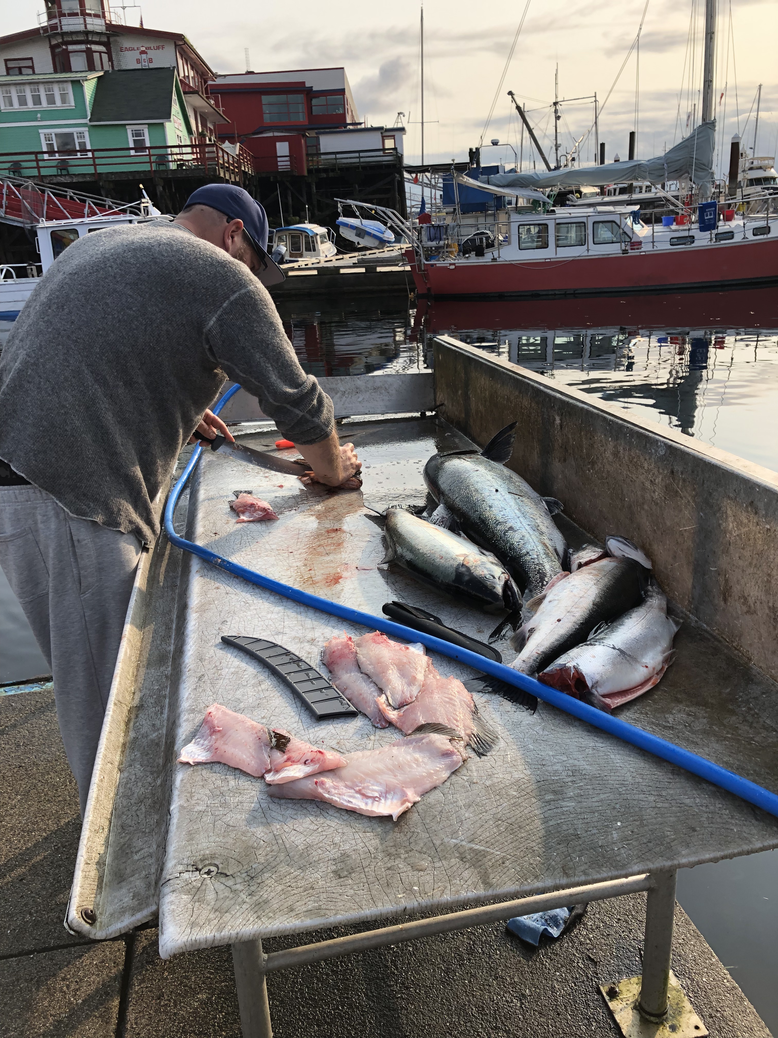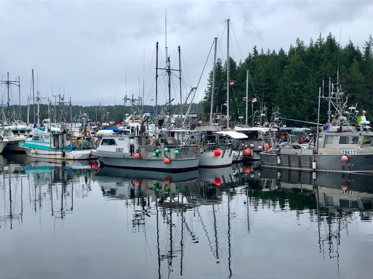 As we enter the Shear Water Marina, dozens of weathered commercial fishing boats with their distinctive winches and buoys line every dock. Commercial and recreational fishing in British Columbia is fiercely regulated: there are certain “Open Seasons” for different fish, daily limits, possession limits, and annual limits. The type of gear used is also specified. For example, fisherman can only use barbless hooks and lines for all varieties salmon; dip nets, ring nets and specific traps for crab; hook and line for halibut, sablefish and cod; and herring jigs, herring rakes, dip nets or cast nets for herring, sardines, anchovies, and mackerel.