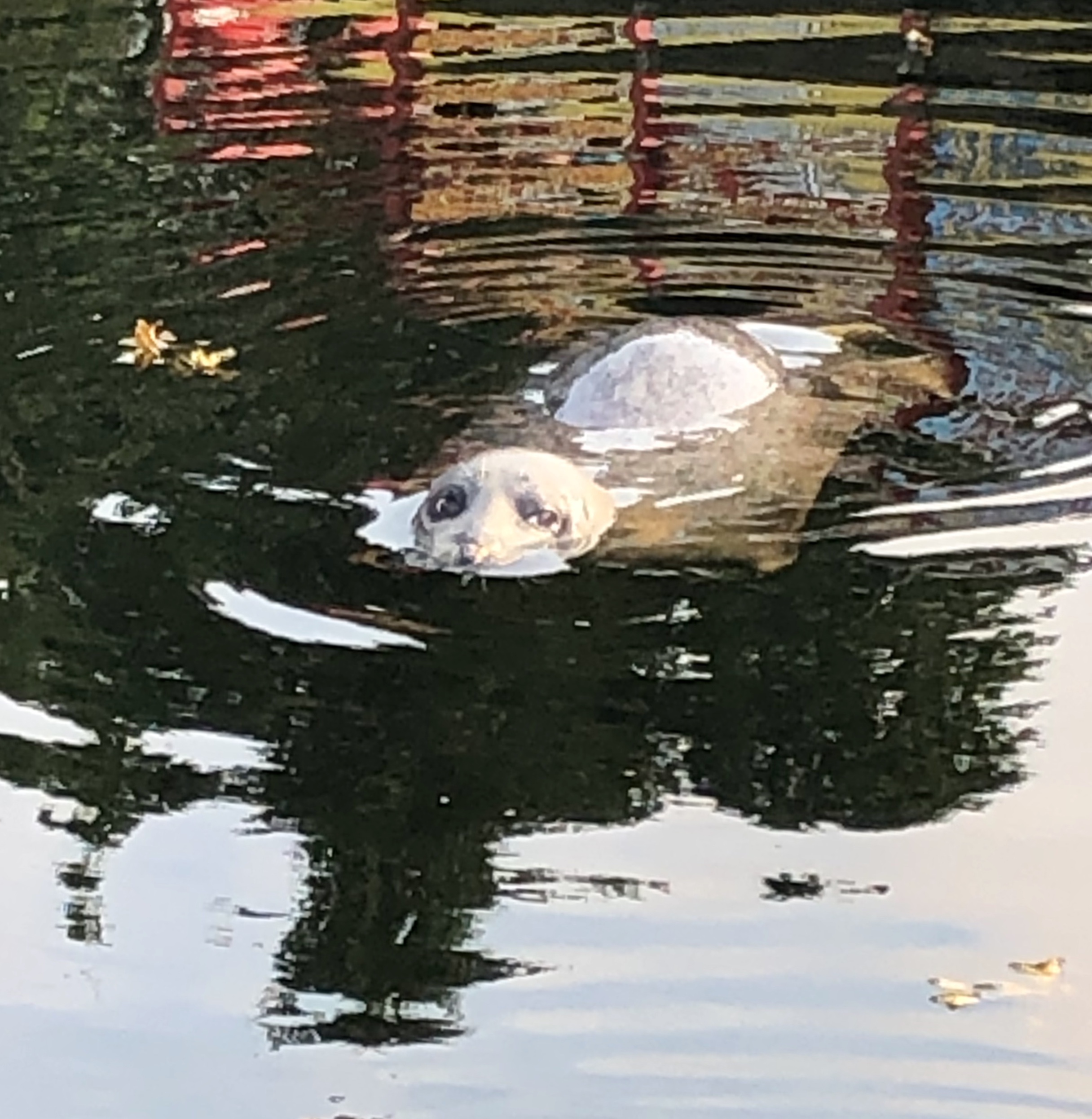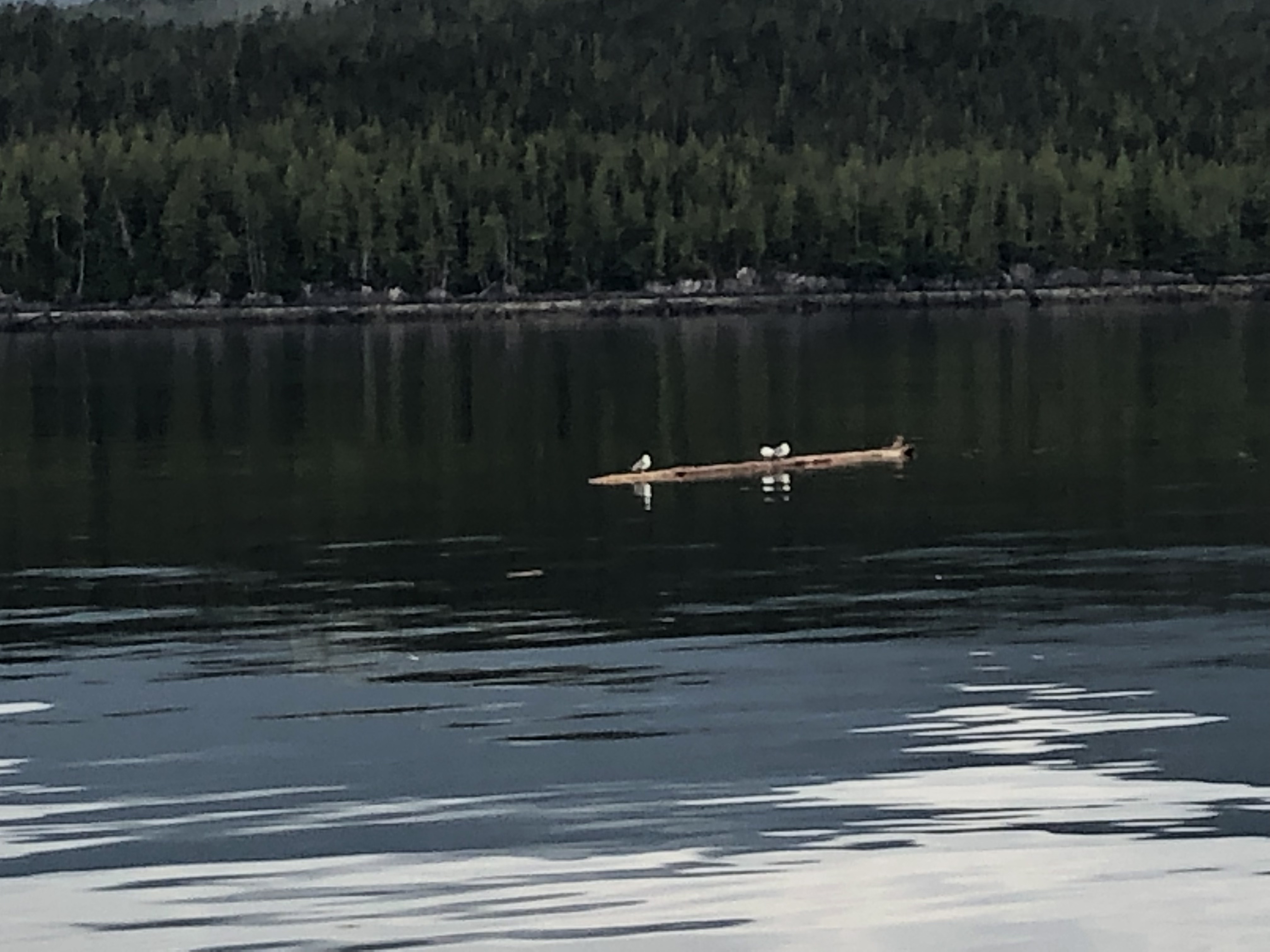 The water is an evergreen color this morning and a row of sea gulls on a floating log looks more like an impressionist’s painting.