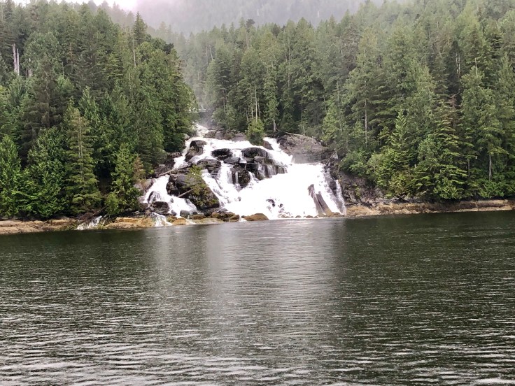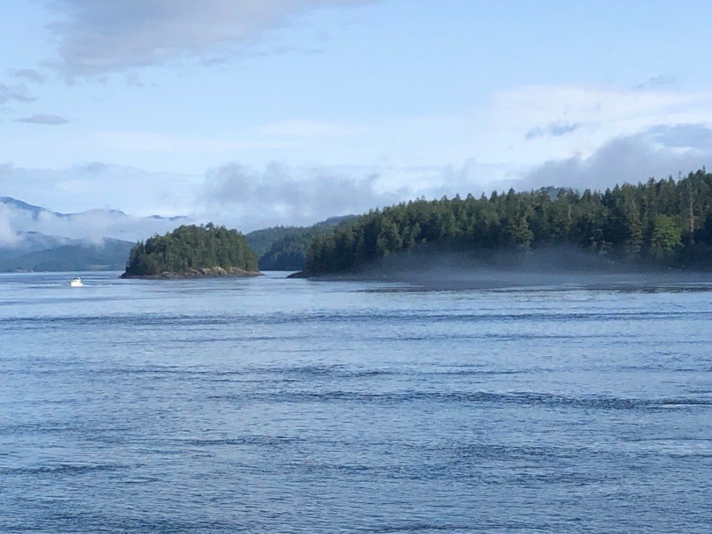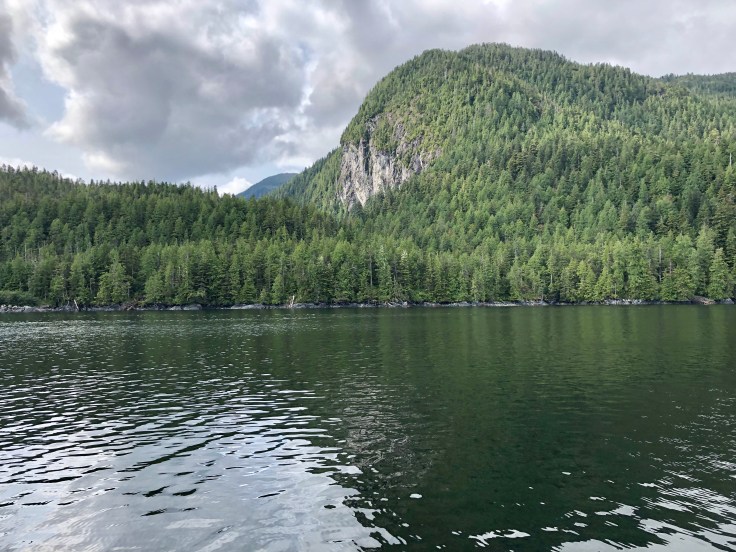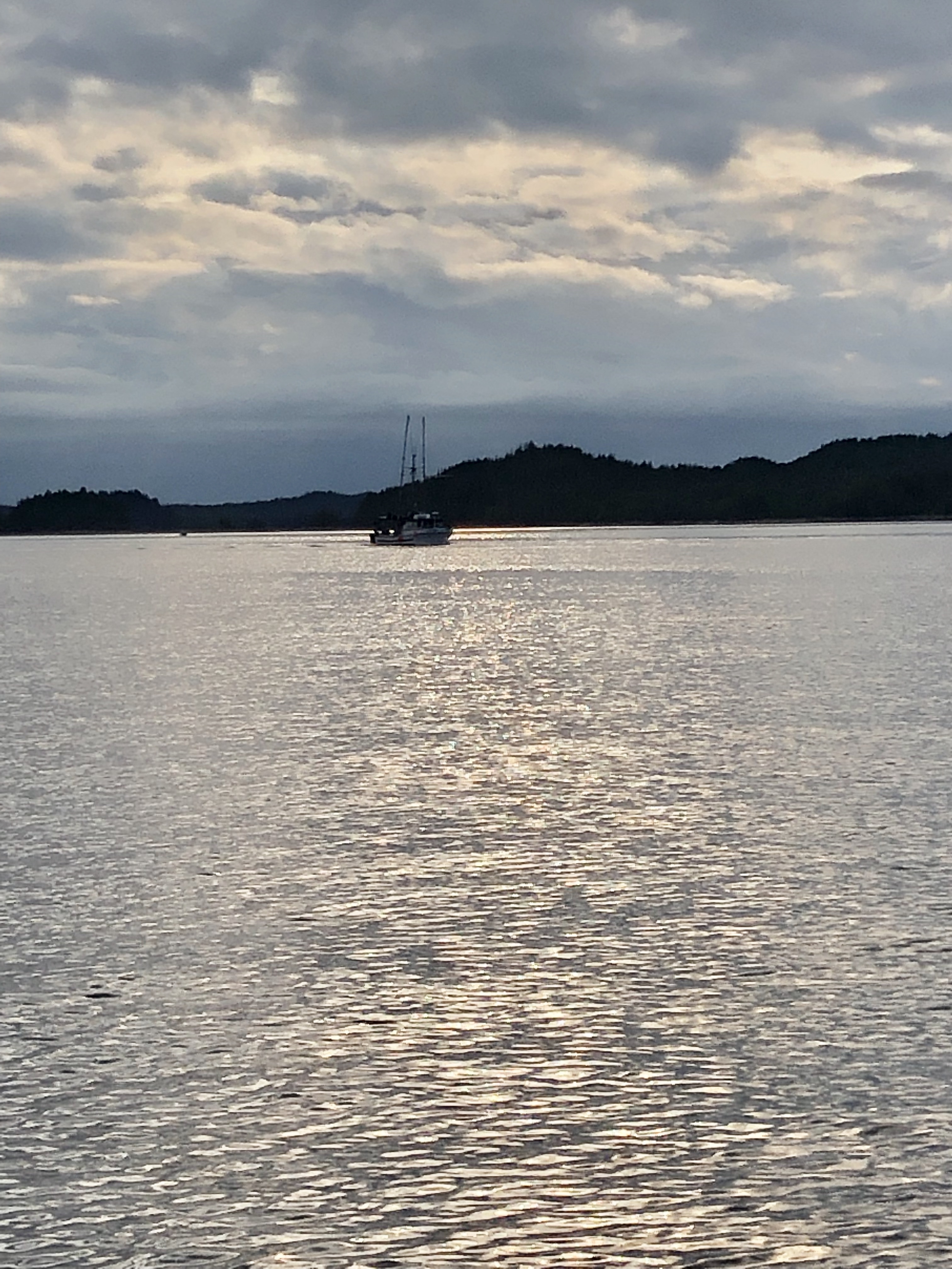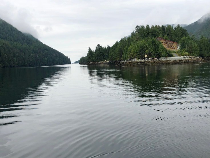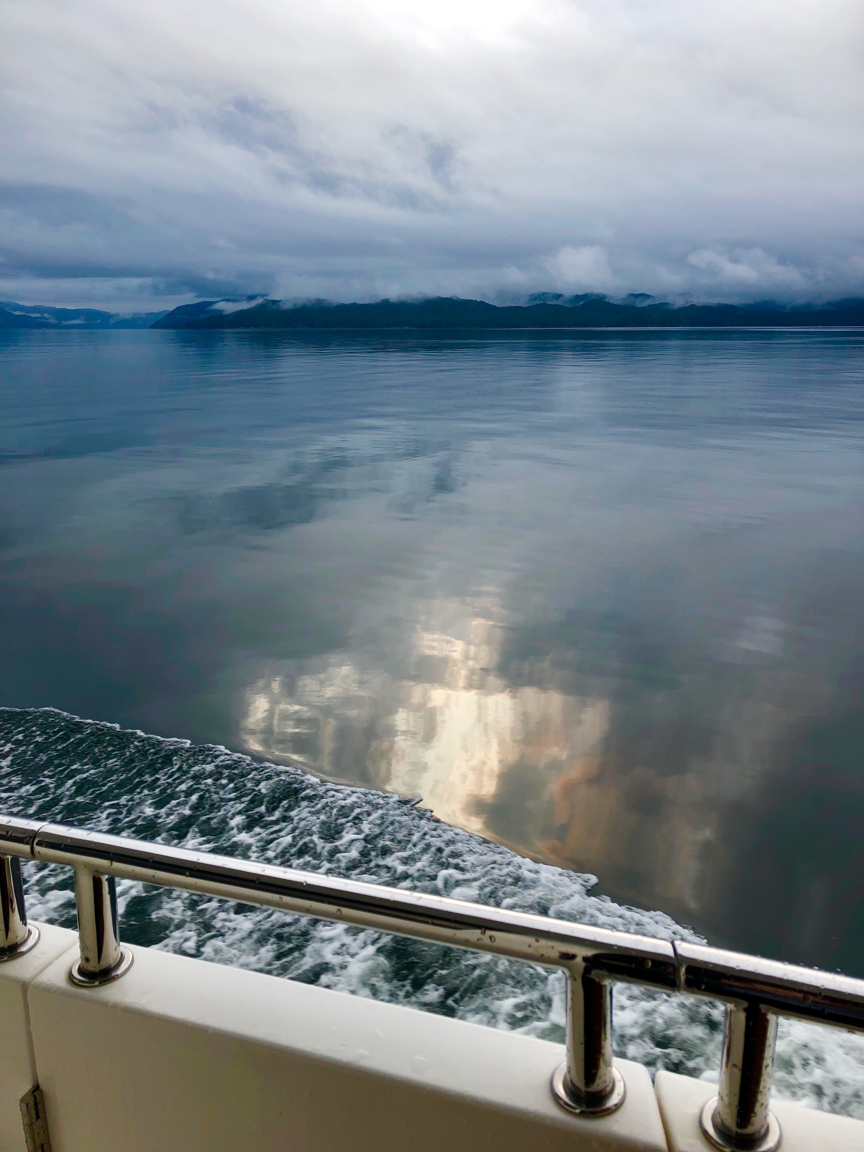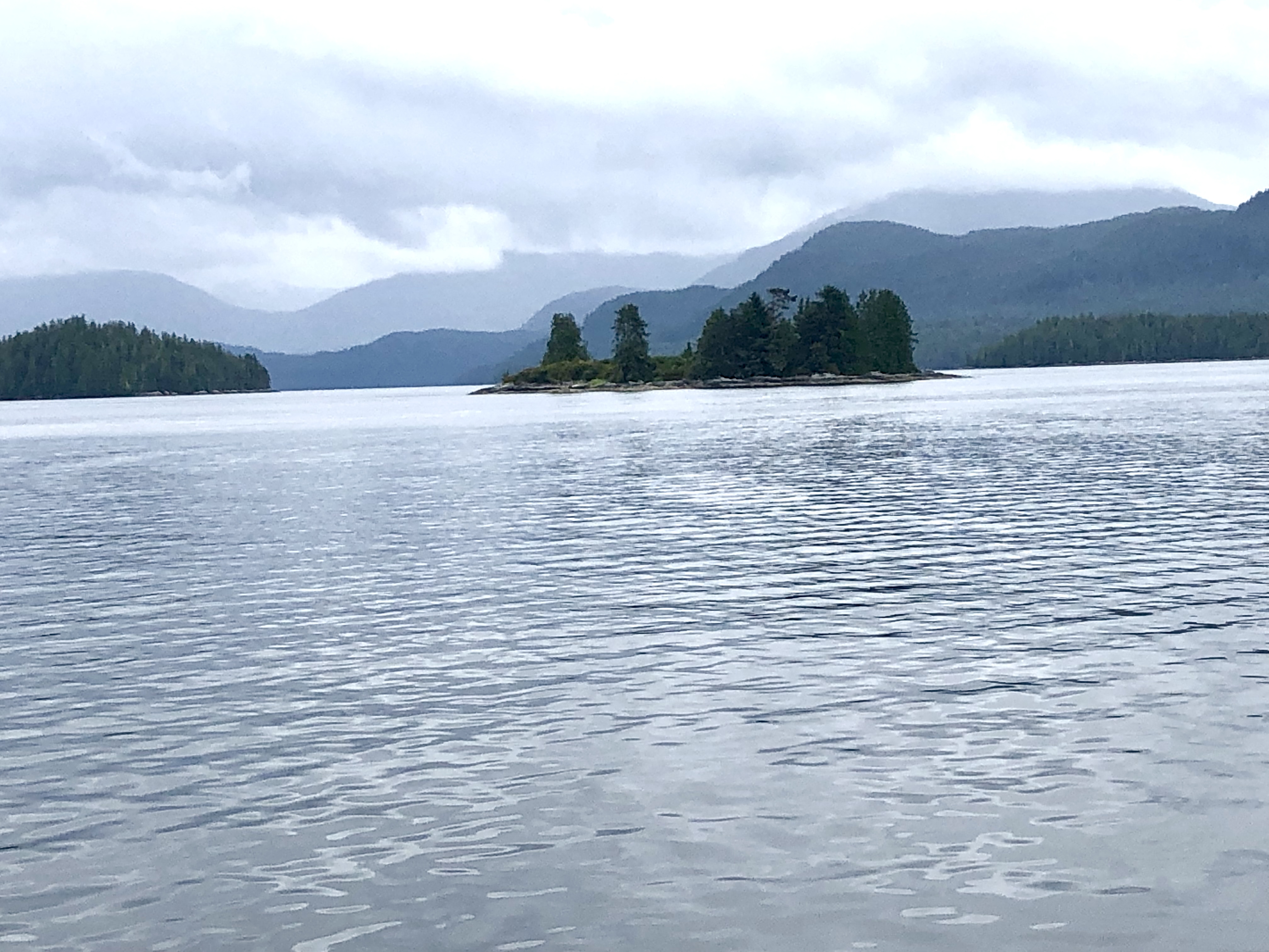 As we enter Chatham Sound, there are clusters of small islands in all directions but it’s starting to rain obscuring the details in a silvery gray mist. I curl up for a nap on the bench in the pilot house, the hum of our engines lulling me to sleep.