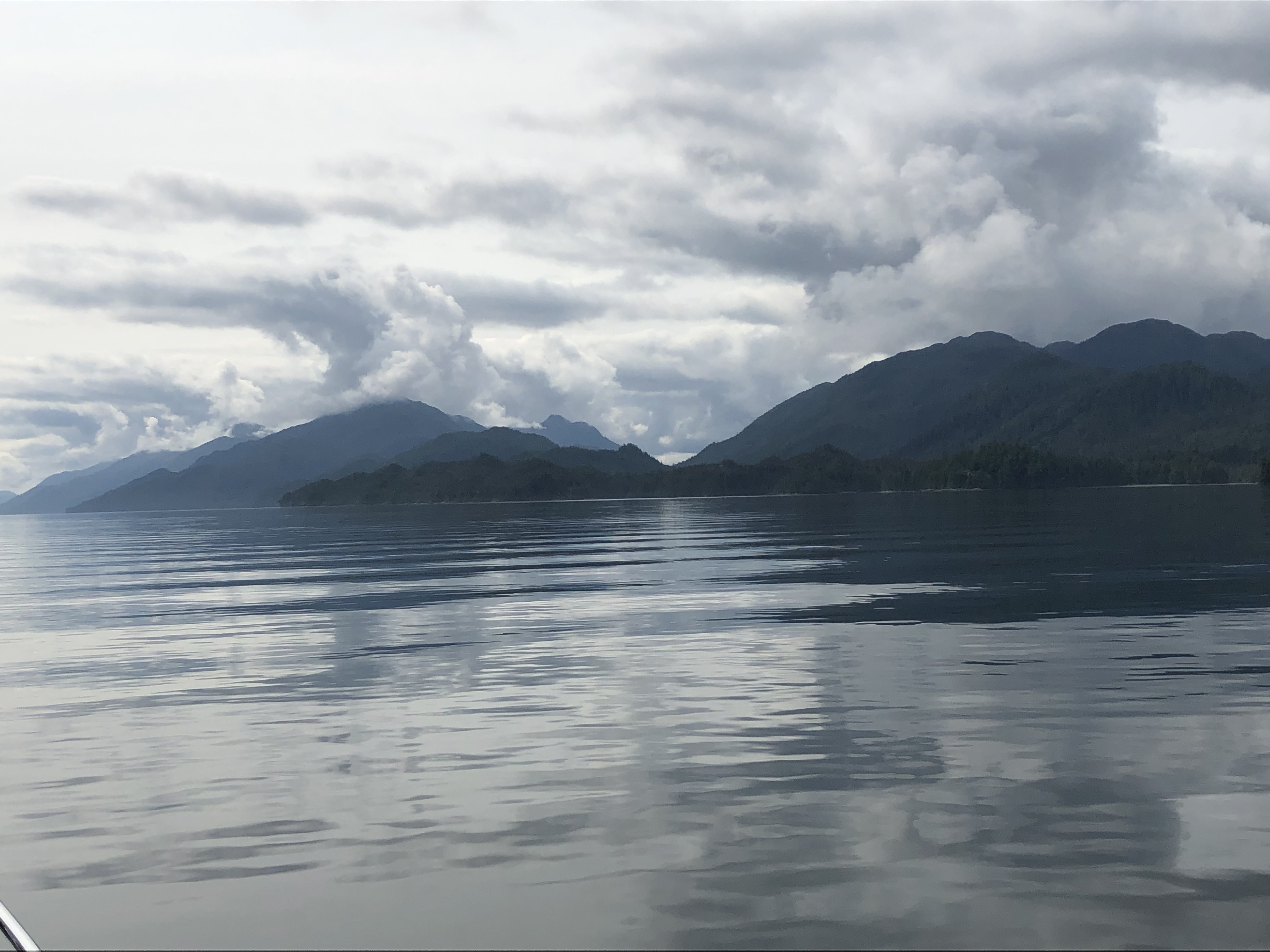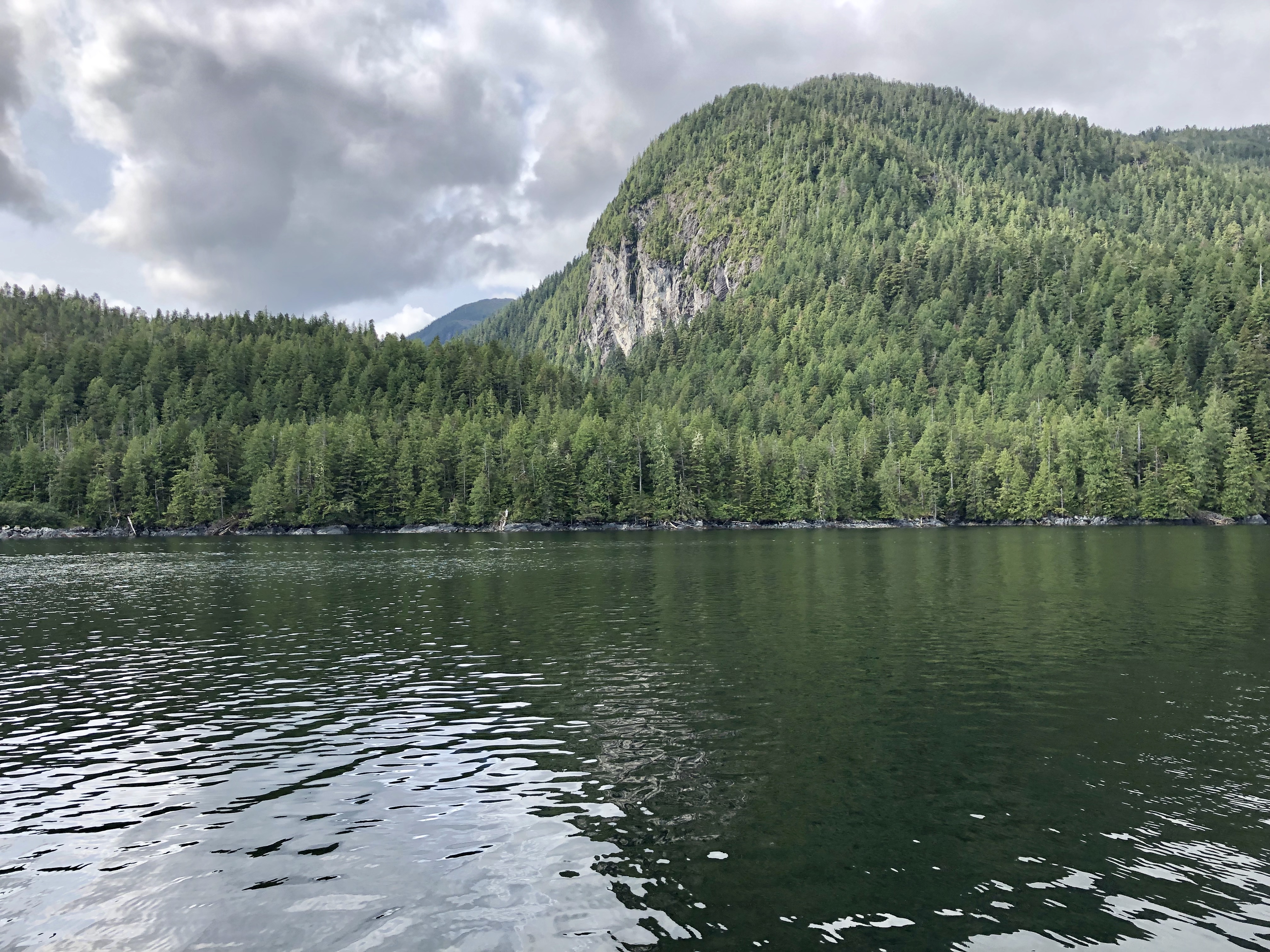 Described by a coast pilot account written in 1891: “In Grenville Channel, the land on both sides is high, varying from 1500 to 3500 feet and as a rule densely wooded with pine and cedar. The mountains rise almost perpendicular from the water and cause the southern portion of this narrow channel to appear even narrower than it is. But the general effect of so many mountains rising one behind the other renders the Grenville Channel one of the most beautiful landscapes in these waters.”