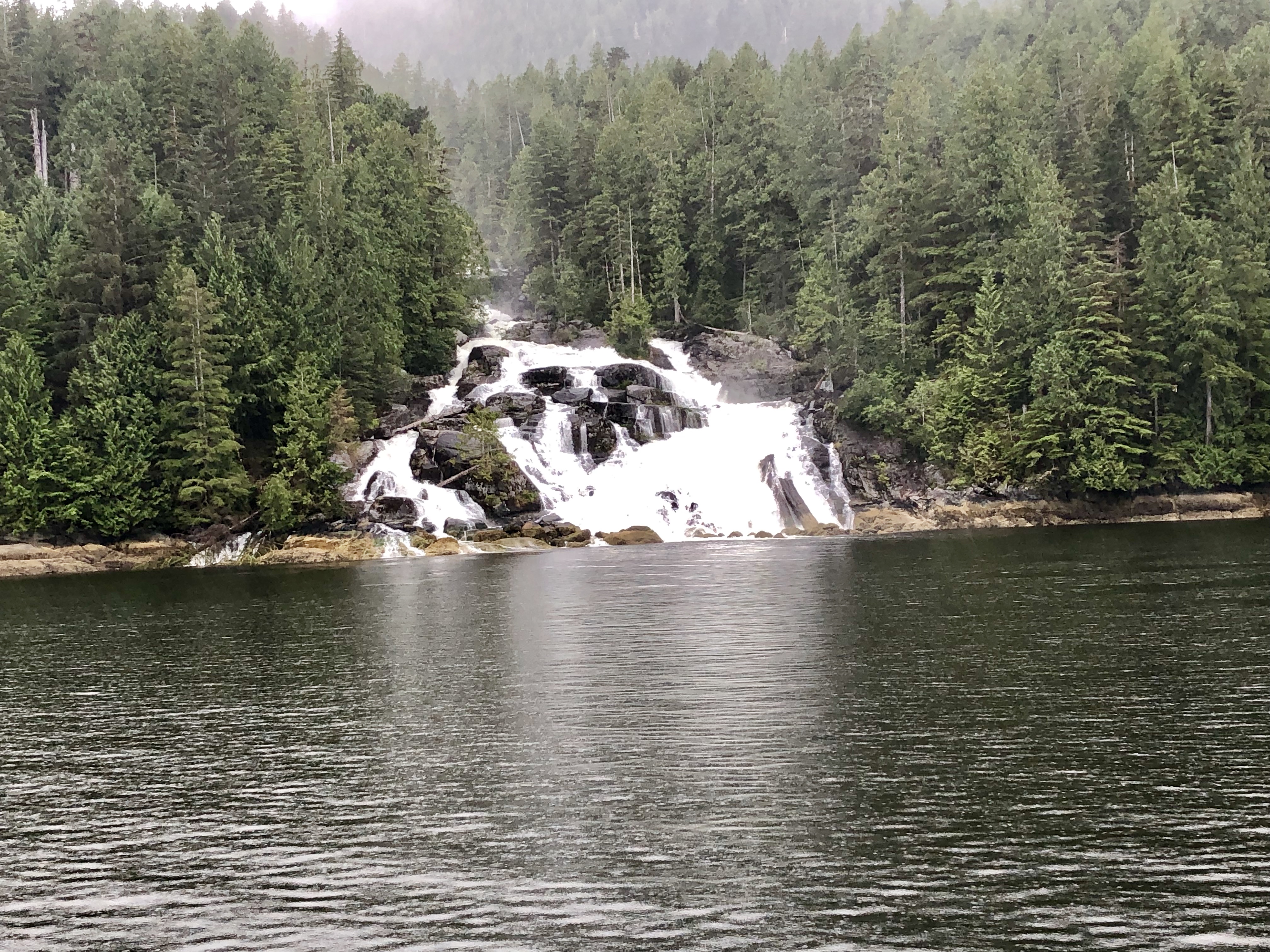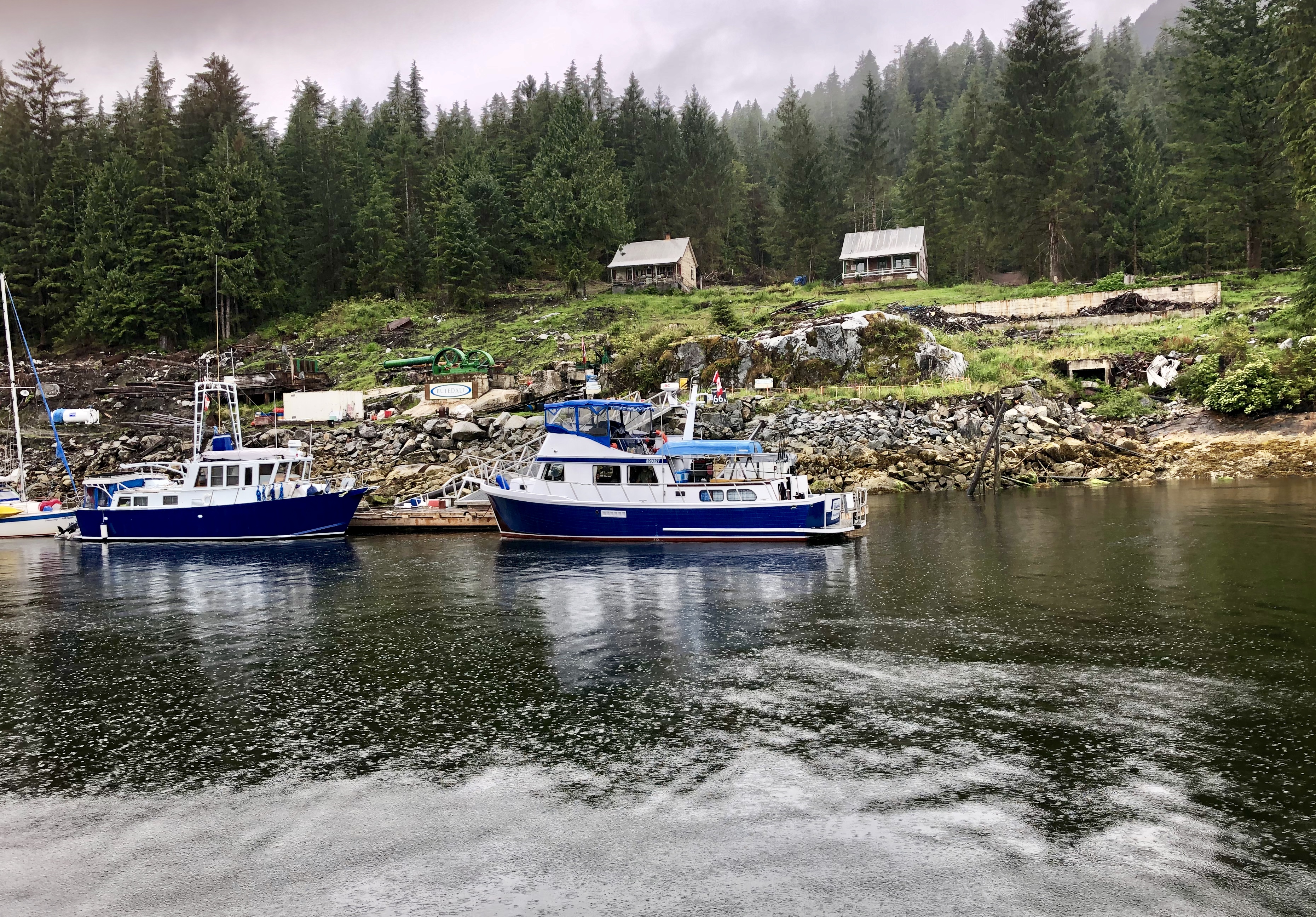 Our weather is also overcast and cold as we search for anchorage for the night at an abandoned cannery near Butedale Falls. When we arrive, it’s raining hard, and the small floating dock is already crowded. Chris determines it’s too deep to anchor so we continue south past the iconic Boat Bluff Lighthouse on Sarah Island.