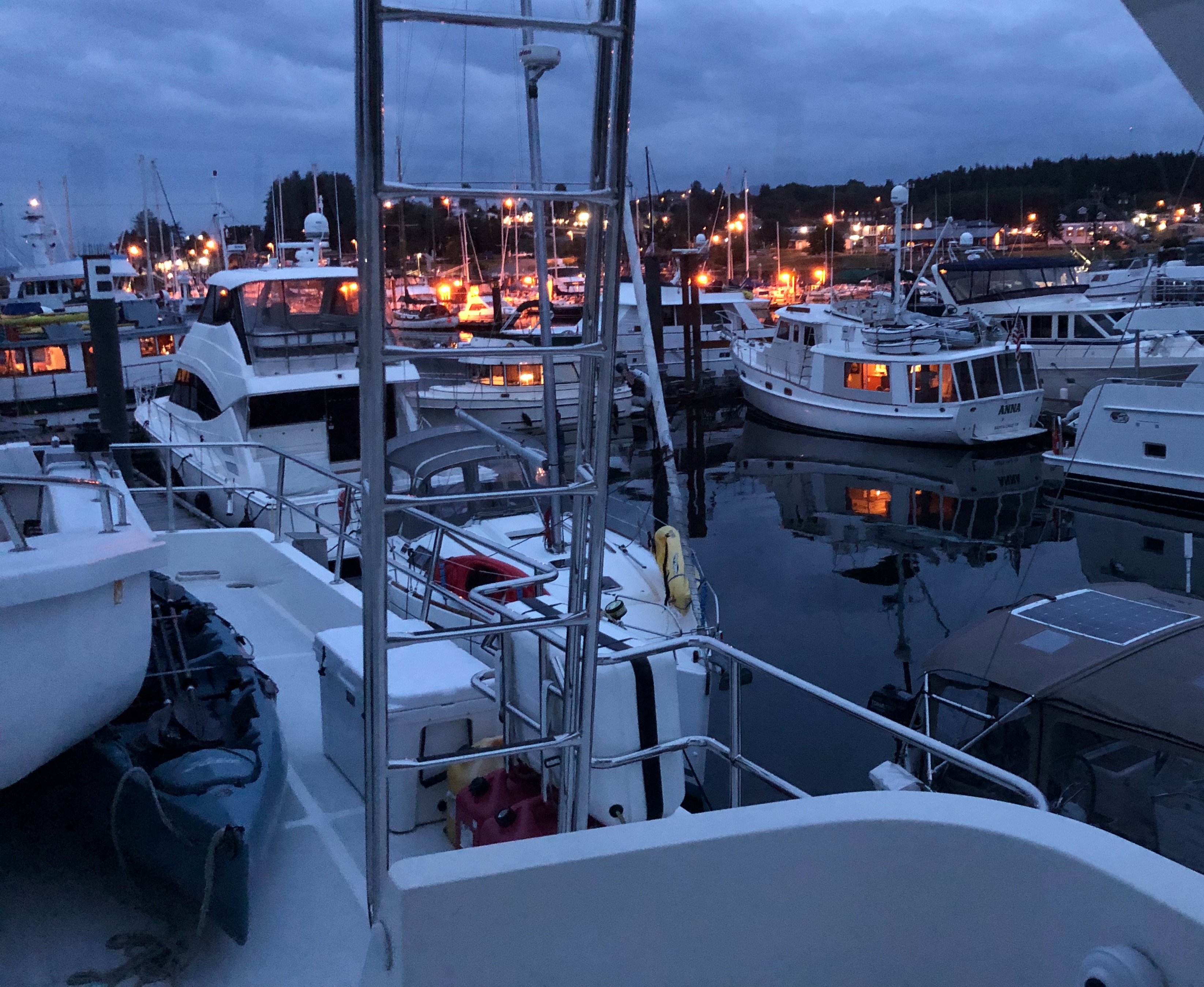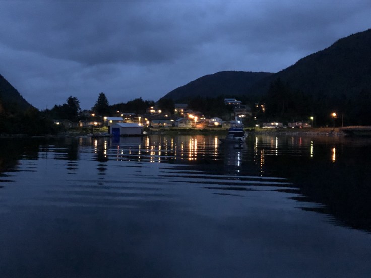 Klemtu is a tiny village on Trout Bay; the few slips at the marina are already full. We’ll need to anchor, and Chris carefully consults the charts to ensure situating the yacht so we won’t be high and dry when the tide changes. A delicate maneuver to set the forward and aft anchors after which we shut down the engines, turn off the running lights, and switch on our anchor light.