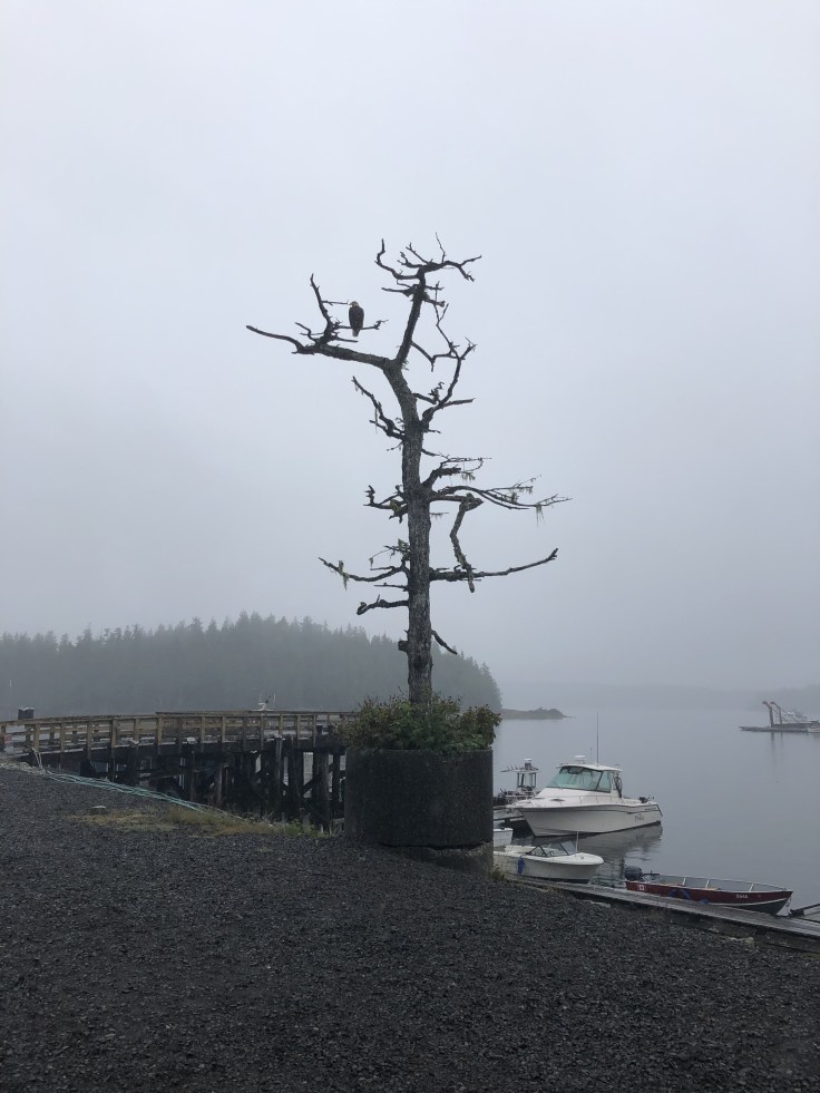 While it’s starting to rain, Chris wants to fill up at the fuel dock before we tie up for the evening since we have a very long run tomorrow. Once snuggly in our slip at the dock, I take pictures of the majestic eagle standing guard on a nearby snag.