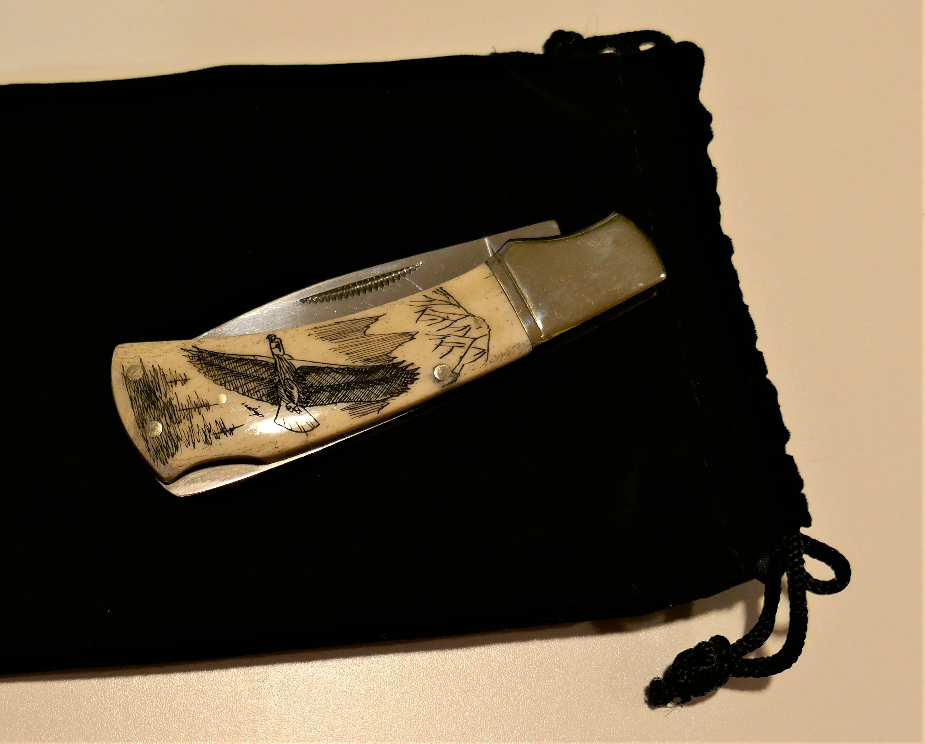 I select a lovely small knife with a curved scrimshaw handle delicately etched with an eagle and fir trees. The cost is more than double what I paid for the first knife. As they run my credit card, the fact I no longer worry about the cost is a testament to how much my finances have improved over the last few years.