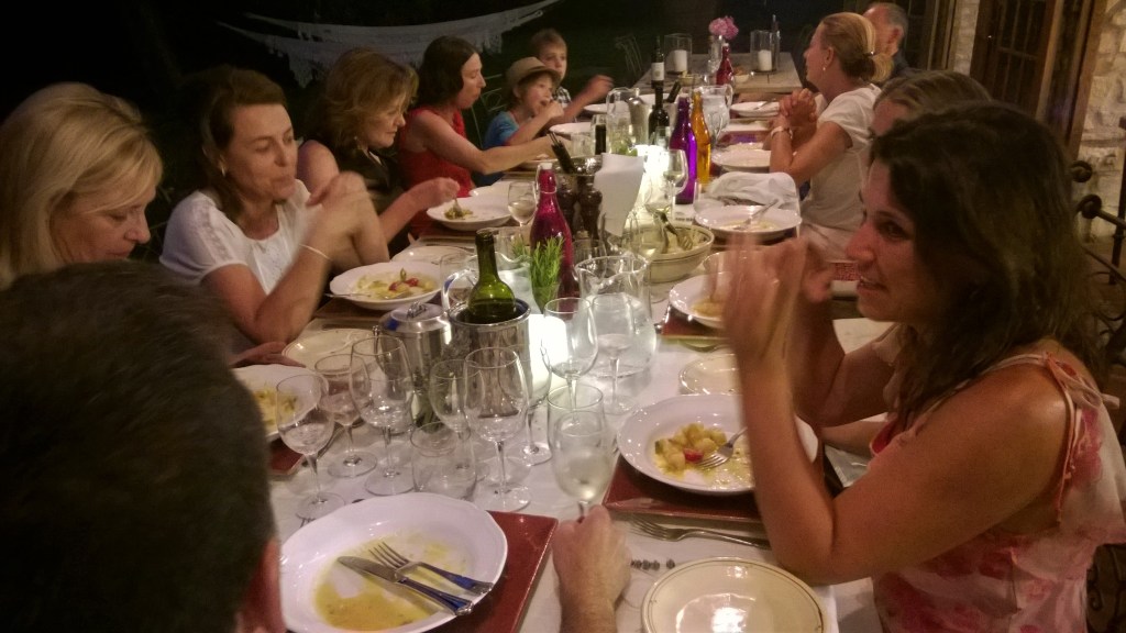 There is a short break before dinner when we can rest, swim in the pool, or schedule a massage. I opt for a quick dip and then curl up in one of the pool’s pillowed alcoves with a good book. Dinners are served at a long pine table under the grape arbor starting at 8:00 PM and stretch for hours with a local wine accompanying each course. After dessert, there are platters of cheese, pears, and toasted nuts. Franco sets an enormous rustic basket on the table—it’s full of odd-shaped bottles holding an assortment of grappa, exotic liqueurs like Limoncello or pistachio cream, and tawny ports.