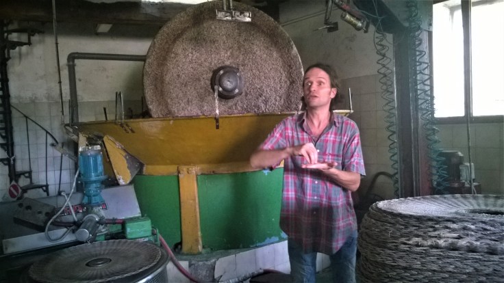 After visiting the Bussati linen factory, our next stop is the Ravagni Olive Oil factory—where the same family has been pressing olive oil on wicker discs since 1421. Definitely my favorite excursion of the week. Francesco explains the fascinating ancient process standing in front of the giant stone crusher in the mill. At Ravagni, they still use large wicker discs to press the oil, and nothing is automated. For centuries, local villagers have been bringing the olives harvested in their gardens here for pressing. In medieval days, the olive oil would be stored in earthenware jugs; today they leave with amber-colored bottles of the silky green liquid that is the basic building block of the Mediterranean diet.