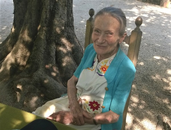 Our delectable three-course lunch has been prepared by Grandma Ravagni who wears a turquoise sweater over her sweet cotton dress on a day when the temperature is 98-degrees. In my broken Italian, I ask permission to take her picture. She sits on a wooden ladder-back chair in the shade of a giant tree and smiles sweetly at the camera. She bears such a striking resemblance to my own grandmother, down to the simple gold rings on her fingers and the way she clasps her gnarled hands on her lap.