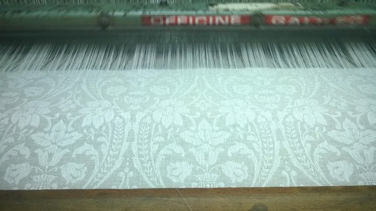 We watch in amazement as one of the weavers demonstrates how when patterns are changed on the looms, hundreds of threads must be painstakingly inserted by hand into the needles, a process which can take several days.