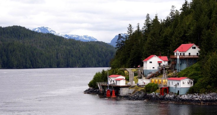 Here we enter Fitz Hugh Sound where the ghost town of Namu lies to our west. At one time, Namu had a population of 400 cannery workers, office personnel and their families. The cannery was started in 1893, followed by a sawmill in 1909 to provide lumber for the cases of salmon. As with most canneries at the turn of the century, labor, working hours and housing were segregated into groups of First Nation natives, Japanese, Chinese, and Caucasians. The British Columbia Packers Ltd, the largest fishing and fish processing company in B.C., took over operations in 1928. By 1970, structures included several two-story bunkhouses, dozens of family cottages, recreation and mess halls, along with the fish processing facilities, an electric power plant, and a large pier—all connected by a maze of boardwalks.