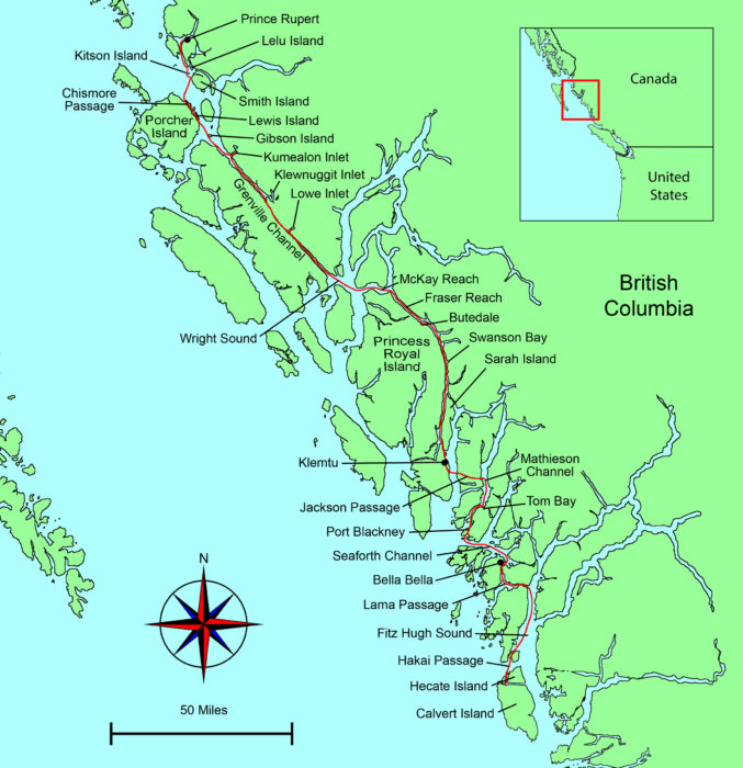 Queen Charlotte Strait between Vancouver Island and the mainland of British Columbia connects Queen Charlotte Sound with Johnstone Strait to Discovery Passage, the Strait of Georgia and eventually Puget Sound—an important link in the Inside Passage from Seattle to Alaska used by the men who sought their fortunes in the Klondike gold fields a century ago.