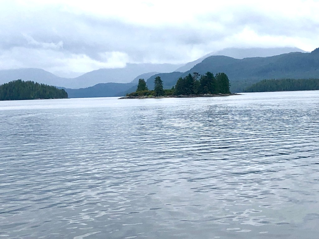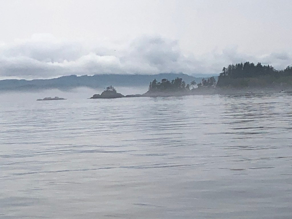 As we leave civilization behind, the water is a gray silk mirror. We thread the narrow channel between Denny Island and Campbell Island, then skirt the north side of Hunter Island. Sailing down its eastern shore, the channel widens along Nalu Island and Hecate Island. The fog and rain only add to the beauty of this place.