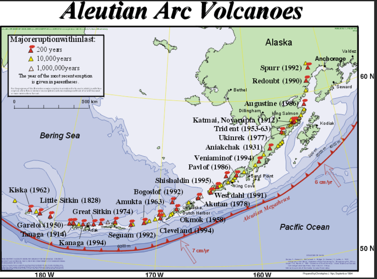 There are more than 130 volcanoes in Alaska and dozens have erupted in the last 100 years. Mounts Shishaldin on Umimak Island, a picturesque volcano, symmetrical and smooth like Mount Fuji in Japan, erupted in 2020. The tallest mountain peak in the Aleutian chain of islands rising over 9000-feet above sea level, its upper portion is covered year-round in glacial snow and ice, and a thin stream of smoke continually rises from the crater. At over 10,000 feet high, major eruptions of the imposing Mount Redoubt, just west of Cook Inlet, grounded jetliners in Anchorage for days (1989 and 2009).