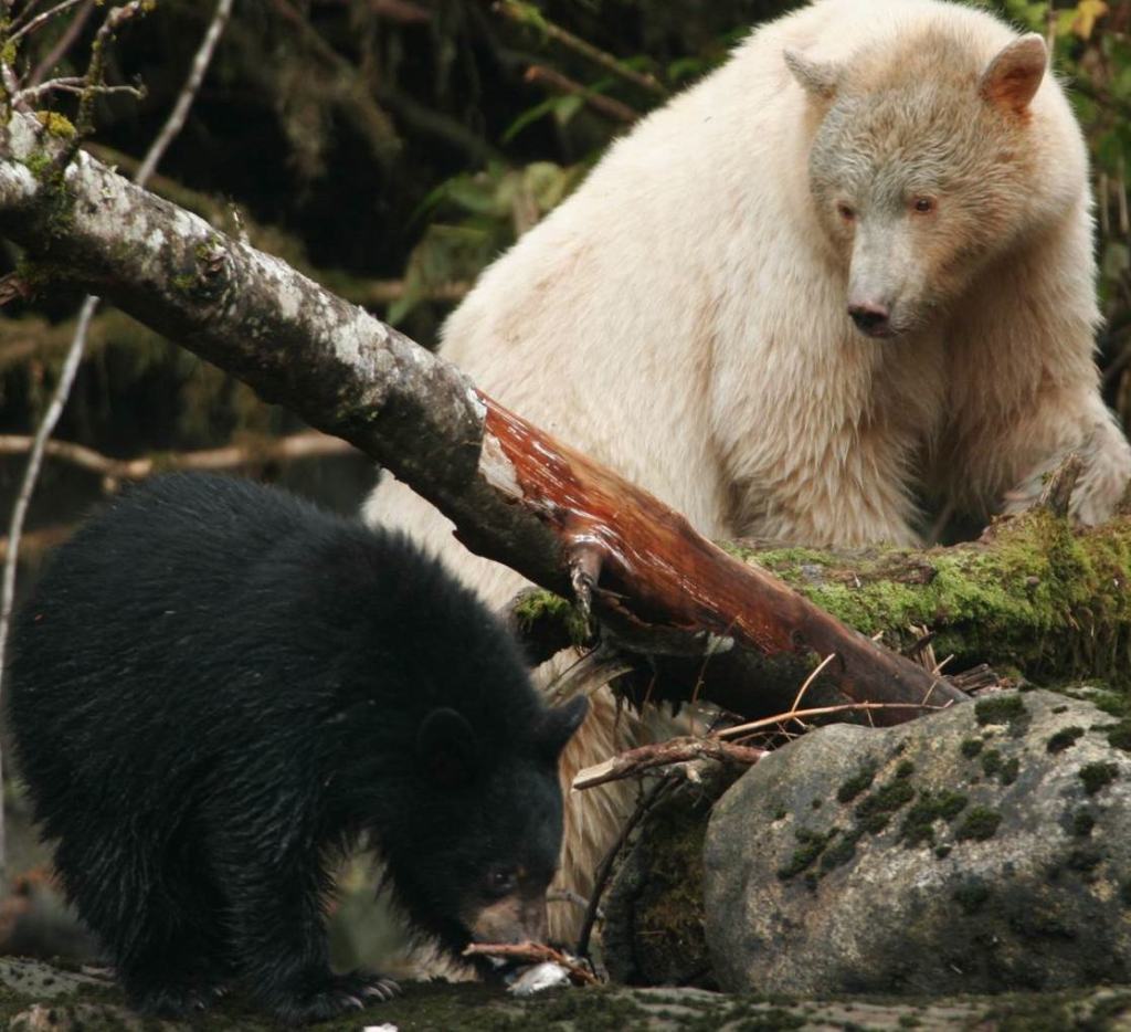 We are in the heart of the Great Bear Rainforest, roughly 16 million acres, one of the largest remaining tracts of unspoiled temperate rainforest left in the world. The area is home to grizzly bears, cougars, wolves, salmon, and the Kermode or “spirit bear,” a unique subspecies of black bear. One in ten cubs displays a recessive, white-colored coat!