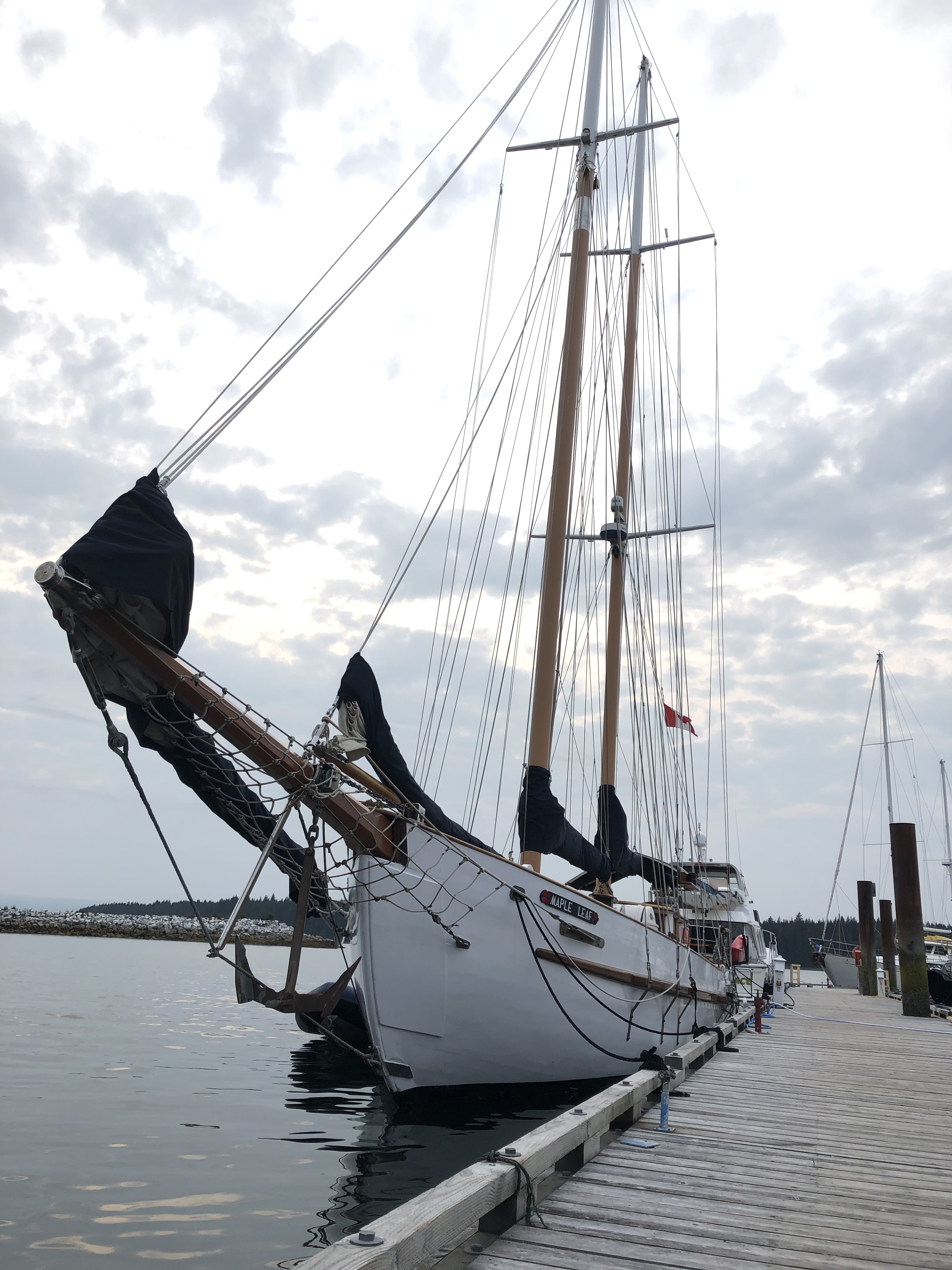 As it’s the height of summer, the docks are crowded with all sizes of pleasure boats, yachts, even tall-masted schooners. Our berth is a tight squeeze between two other boats. After tying up for the night, we enjoy fresh Halibut fish & chips at the local pub.